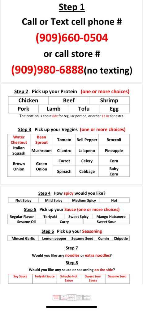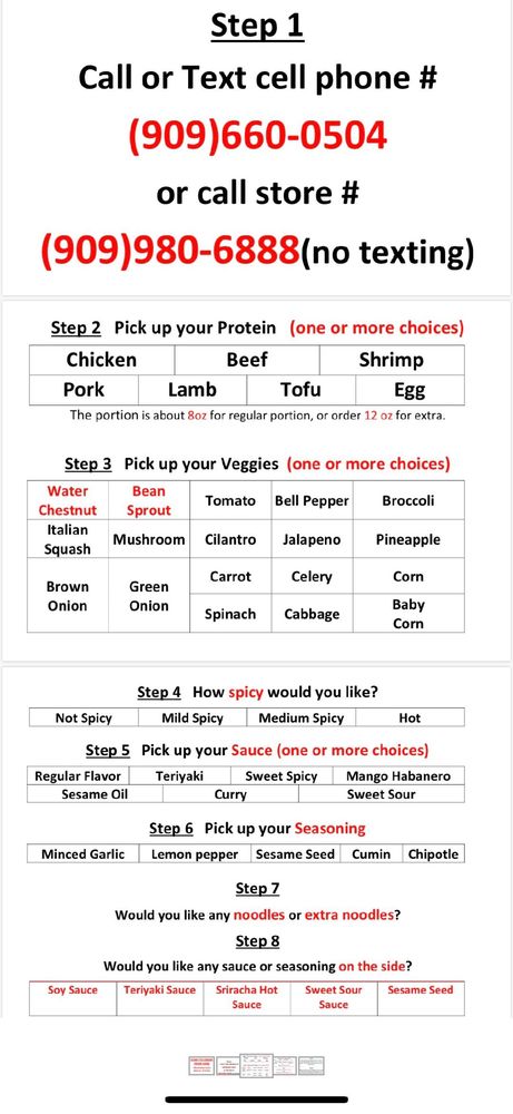 Choice of protein, vegetables, noodles, spice level, sauces and Seasonings! Includes white rice.